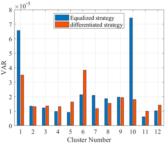 Under the differentiated strategy, aging exhibited a slower rate and tended to converge, whereas the equalized strategy led to contrasting trends. The former resulted in a 16% extension in service duration. Variances in SOH across clusters were calculated as an inconsistency indicator, and Figure 39 shows a comparison of cluster SOHs after decommissioning. The sums of variances were 2.1821 × 10−4 and 2.8150 × 10−4, respectively, amounting to a 22.48% decline.