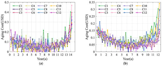 (a) Annual aging cost per kilowatt-hour under differentiated dispatching strategy; (b) annual aging cost per kilowatt-hour under equalized dispatching strategy.