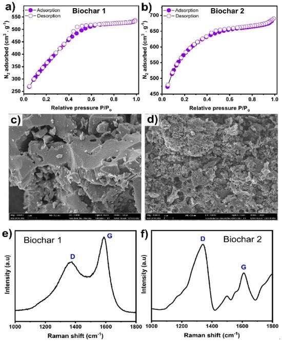 Properties of chemically impregnated biochar 1 and biochar 2: (a,b) adsorption–desorption isotherms of N2, (c,d) FESEM images, and (e,f) Raman analysis. Reproduced with permission from [42], copyright 2022.