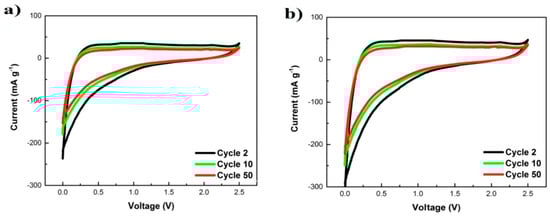 Researchers report the slow catalytic pyrolysis of green toxic macroalgae to produce biochar. The magnetic biochar generated in the presence of iron as a catalyst exhibited exceptional textural qualities, with a specific surface area of 296.4 m2/g. Cyclic voltammetry was performed on biochar in Figure 4a and magnetic biochar in Figure 4b during the 2nd, 10th, and 50th cycles, with a scan rate of 0.05 mV s−1. Half-cells exhibited typical CV curves for carbon-based anode materials in LIBs. Furthermore, the electrode materials demonstrated strong reversible reactions and stability based on the observable overlaps between the two cycles. The area of the CV curves in both electrodes was determined, and magnetic biochar had a high area under the CV curves, which is attributable to Fe concentration; consequently, doping with Fe increases the capacity of anode materials in Li-ion batteries [74,75,76].