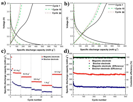 Charge–discharge investigation of (a) biochar and (b) magnetic biochar, (c) capacity as a function of current density, and (d) cycling curves. Reproduced with permission from [76], © 2019 Elsevier Ltd. All rights reserved.