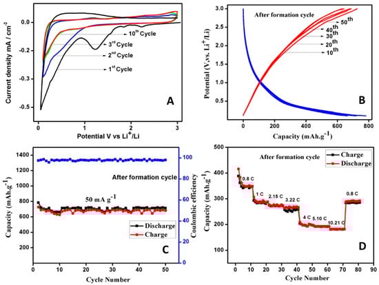 (A) CV curves of carbon derived from human hair, (B) charge–discharge profiles, (C) capacity retention, and (D) capacity as a function of current density. Reproduced with permission from [80], Copyright © 2014 Elsevier Ltd.