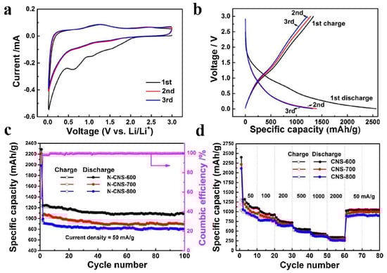 To produce porous carbon material, plane tree leaves were pyrolysed at temperatures between 500 and 800 °C in an inert atmosphere. The discharge–charge curves of carbon-based biomass that was calcined at 500, 600, 700, and 800 °C are shown in Figure 11. The primary cause of the first loss of capacity is the abundant carbon pores due to electrolyte breakdown and surface hydrogenation, which traps lithium ions and fills the gaps [95]. The best specific surface area and maximum Coulombic efficiency were found in carbon calcined at 700 °C, indicating that porous materials aid in the intercalation and deintercalation of the reversible lithium cycle. Furthermore, calcined carbon at 800 °C has charge voltages of about 1.0 V, which is different from 600 and 700 °C. This difference in charging voltages encourages lithiation through pore channels and a high specific surface area [96,97].