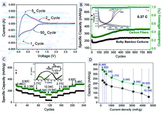 Biomass research is a robust sector that produces useful and valuable products. The study used a feedstock from bamboo chopsticks as a carbon source and was exposed to a hydrothermal synthetic route in alkaline media to produce biochar. Figure 10A–D shows the findings of a study on bamboo-derived carbon fibres. Figure 10A shows the CV analysis of cathodic behaviour throughout an increasing voltage window, which is mostly linked with Li intercalation into the carbon matrix. The disappearance peak in reduction is caused by irreversible reactions, including SEI degradation in carbon fibres. The feedstock was utilised to make carbon fibres, which were then carbonised to incorporate graphitic pieces. The material was further examined for electrochemical performance in LIBs and demonstrated improved rate capabilities (see Table 4). The researchers next grew MnO2 atop the carbon matrix to build a 3D core shell with synergetic effects, which led to the excellent cycling performance of the hybrid electrode material. The good anode material for LIBs is the result of the synergistic effects of nanostructured metal-based oxide(s) anchored to the carbon matrix [84,85,86,87,88].