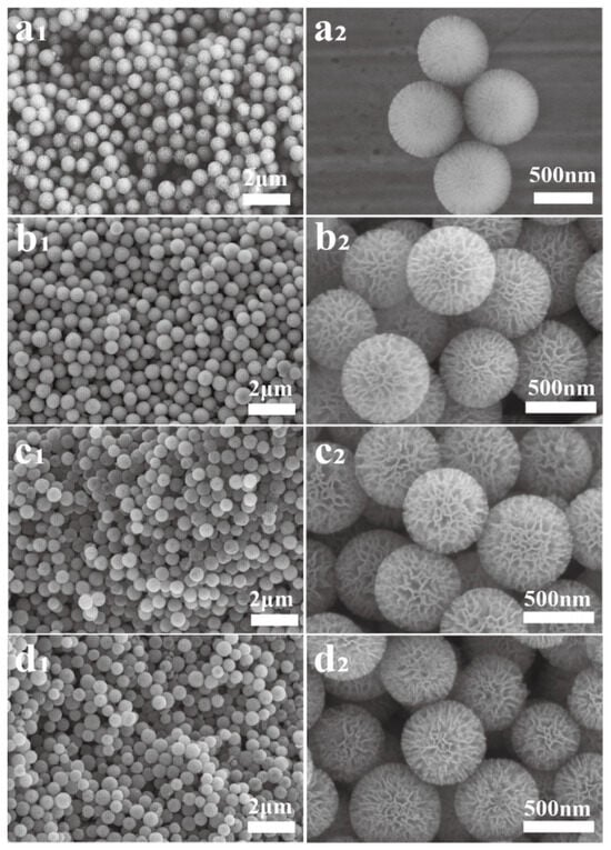 The morphology and structure of DFNS and SiO2/C composites can be analyzed using SEM and TEM. As shown in Figure 1, both the pure DFNS (Figure 1a1,a2) and SiO2/C composites are nanospheres with diameters of about 500~600 nm and can be visualized as a pompon mum-like porous structure. In addition, the C/DFNS-50 (Figure 1b1,b2) obtained by the reaction of DFNS with glucose, as well as the C/DFNS-6 (Figure 1c1,c2) and C/DFNS-1 (Figure 1d1,1d2) obtained by corrosion of C/DFNS-50, are relatively uniformly sized nanospheres, and all three of them do not have any significant difference from pure DFNS.