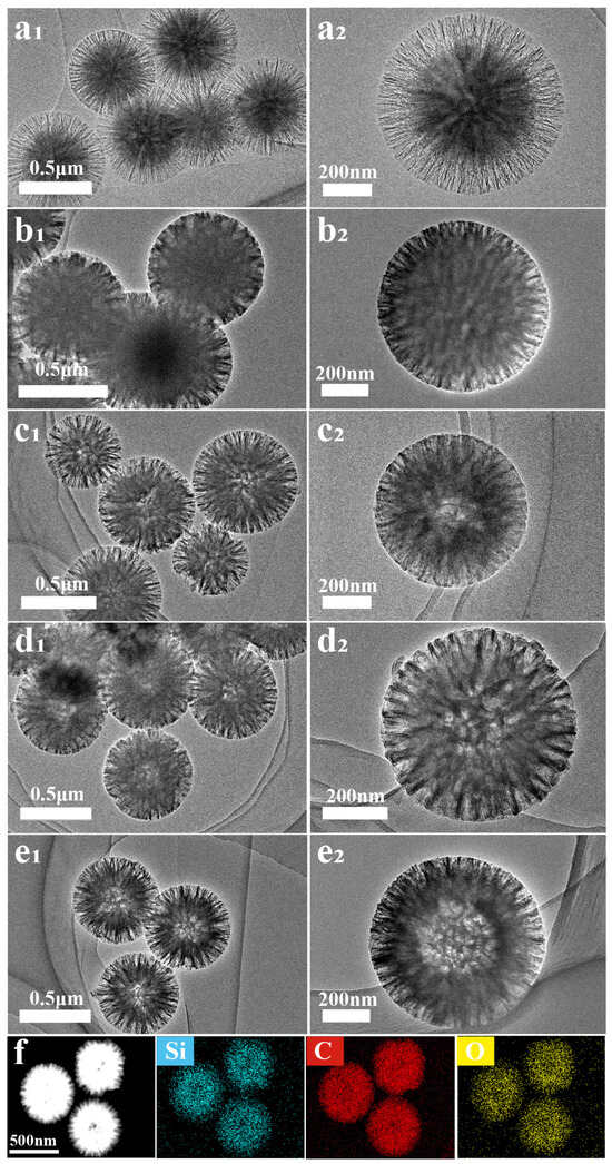 TEM images of (a1,a2) DFNS, (b1,b2) C/DFNS-50, (c1,c2) C/DFNS-10, (d1,d2) C/DFNS-6, (e1,e2), C/DFNS-1 and (f) EDS elemental mappings of Si (blue), C (red) and O (yellow) for the C/DFNS-6.