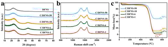 The XRD patterns are shown in Figure 3a to elucidate the structural and compositional characteristics of the samples. From the XRD spectrum of DFNS, a broad peak appears near 22°, indicating the characteristic peak of amorphous silicon dioxide [31]. Two broad peaks near 24° and 44° on the curves of C/DFNS-50, C/DFNS-10, C/DFNS-6 and C/DFNS-1 correspond to the (002) and (100) planes of amorphous carbon, respectively, indicating the presence of amorphous carbon in the four composite samples [32]. In particular, in the XRD spectra of the four composites, there is an overlap between the characteristic peak of SiO2 at 22° and the characteristic peak of carbon at 24° [27]. This indicates that amorphous carbon has been combined with the DFNS material after reacting with glucose. The intensity of the two carbon peaks of C/DFNS-50 in XRD patterns is lower than that of C/DFNS-10, C/DFNS-6 and C/DFNS-1, which is due to the relatively low carbon content in C/DFNS-50.