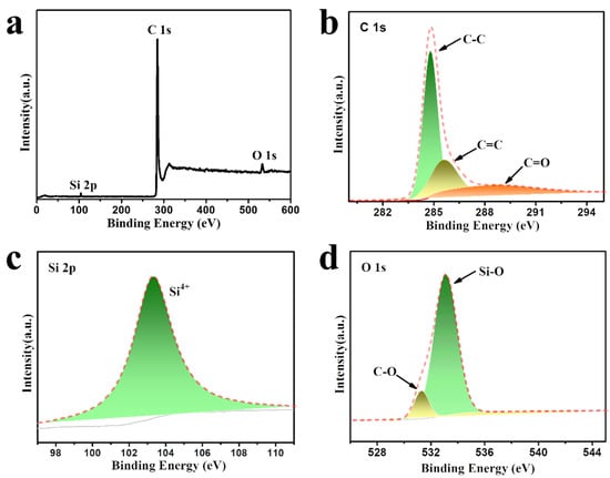(a) XPS survey spectrum and high-resolution XPS spectra for (b) C 1s, (c) Si 2p and (d) O 1s of the C/DFNS-6.
