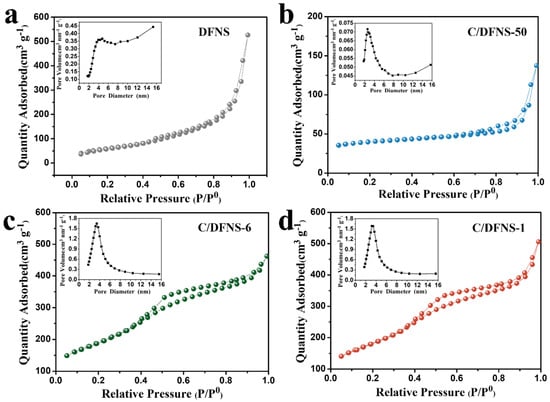 Detailed analysis of the specific surface area and pore structure of DFNS, C/DFNS-50, C/DFNS-6 and C/DFNS-1 using the N2 adsorption/desorption analysis method. As shown in Figure 5, the adsorption/desorption isotherms displayed by DFNS (Figure 5a), C/DFNS-50 (Figure 5b), C/DFNS-6 (Figure 5c) and C/DFNS-1 (Figure 5d) are both I/IV type, with obvious hysteresis loops, indicating the presence of micropores as well as mesopores inside the samples [23]. Table 1 shows the Brunauer–Emmett–Teller (BET) specific surface area of the DFNS, C/DFNS-50, C/DFNS-10, C/DFNS-6 and C/DFNS-1 is 223, 127, 573, 672 and 651 m2 g−1, respectively. And their pore sizes are all distributed in the range of 1.7–15.6 nm, which are confirmed by the pore size distribution graphs inset in Figure 5a–d. The total pore volumes of DFNS, C/DFNS-50, C/DFNS-10, C/DFNS-6 and C/DFNS-1 are 0.33, 0.06, 0.46, 0.64 and 0.60 cm3 g−1, respectively, and the average pore sizes are 5.43, 4.18, 3.47, 3.52 and 3.48 nm, respectively. It is clear that C/DFNS-50 obtained after successful loading of the carbon layer by DFNS has the smallest specific surface area and pore volume, while C/DFNS-6 obtained after corrosion of SiO2/C composites for 10 h has the largest specific surface area and porosity, which may give C/DFNS-6 more exposed active sites and electrolyte diffusion channels. Therefore, the etching time of 10 h can make C/DFNS composites have the best specific surface area and porosity, which is expected to achieve the rapid transport of Li+ and electrons [38].