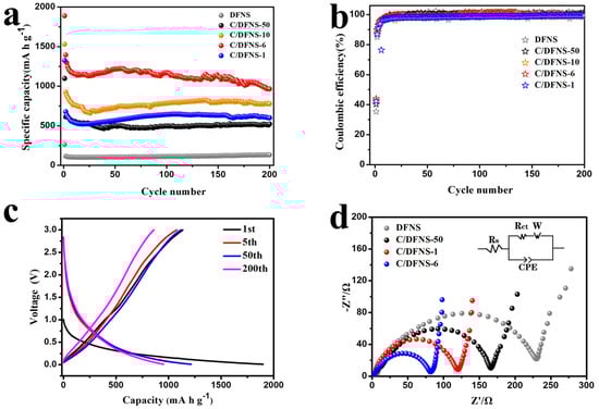 (a) Cycling performance and (b) coulombic efficiency at 0.2 A g−1 of DFNS, C/DFNS-50, C/DFNS-10, C/DFNS-6 and C/DFNS-1, (c) galvanostatic charge/discharge profiles of C/DFNS-6, (d) EIS spectra of DFNS, C/DFNS-50, C/DFNS-6 and C/DFNS-1.