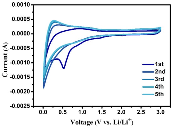 The CV curves of C/DFNS-6 at a scanning rate of 0.1 mV s−1 between 0.01 and 3.0 V are shown in Figure 7. During the cathodic polarization process of the initial cycle, two distinct cathodic peaks were observed at 1.42 V and 0.54 V and then disappeared in the following cycles. A cathodic peak was observed between 1.3 and 1.5 V, which is caused by the reduction and decomposition of the electrolyte and the irreversible formation of the SEI layer on the surface of the negative electrode material [27]. In addition, the peak appearing around 0.5~0.7 V corresponds to the formation of the SEI layer in the electrolyte, the reaction between SiO2 and Li+, and the generation of Si and a series of lithium silicates. (see reaction Equations (1)–(3)) [40,41,42,43], and these non-electrochemically active substances such as Li2O and Li2Si2O5 are uniformly distributed on the SiO2 particles, buffering the volume expansion of SiO2, which is beneficial for maintaining the stability of the negative electrode material structure and improving the cycling life of lithium-ion batteries [22]. As shown in Equation (4) [42], the anodic peak at 0.01 V is related to the alloying reaction of Si and Li+. As shown in Equation (5), the anodic characteristic peak at 0.25 V is related to the LixSi dealloying reaction [42]. During the subsequent scanning, the CV curves of C/DFNS-6 almost overlapped, indicating that the reactions were reversible after the first cycle.