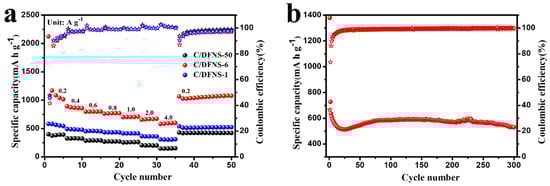 In the Raman spectra of the four composites (Figure 3b), the characteristic peaks at 1340 and 1590 cm−1 belong to the disordered induced band (D) and graphite band (G), respectively. The ratio of these two characteristic peaks (ID/IG) represents the degree of graphitization of carbon in the composite material [33]. The ID/IG values of C/DFNS-50, C/DFNS-10, C/DFNS-6 and C/DFNS-1 are 0.9957, 0.9839, 0.9711 and 0.9789, respectively, indicating the smaller ID/IG ratio of C/DFNS-6 contained more defective carbons [20], which can provide lots of vacancies and defects. Research has shown that defective carbon in materials is beneficial for improving their electrochemical performance [20,33,34]. The characteristic of C/DFNS-6 not only accelerates the diffusion of lithium-ion, but also provides reversible sites for lithium-ion storage.