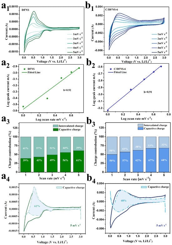 The parameter “b” dictates the extent of capacity contribution from either capacitance or the diffusion-controlled process. Specifically, if b = 0.5, it means that the negative electrode material only has diffusion-control behavior; b = 0.5~1 indicates the coexistence of diffusion-control behavior and pseudocapacitive effect; and b = 1 indicates that it only has a pseudocapacitive effect [32,43]. As shown in Figure 9a2,b2, the b-values of DFNS and C/DFNS-6 are 0.92 and 0.91, respectively, which reveals that the electrochemical processes of these two materials are controlled by these two processes. Subsequently, the contribution ratio of these two processes was accurately studied using Equation (8) [45]. The k1ν and k2ν1/2 represent the contribution rates of capacitance and diffusion-controlled processes, respectively [45]. As shown in Figure 9a3,b3, the capacitance contribution ratio of DFNS gradually increases from 39% to 61% and that of C/DFNS-6 from 50% to 68% with the increase in scanning rate. It can be seen that the capacitance contribution of C/DFNS-6 is higher than that of DFNS at all the same scanning rates, and the larger capacitance contribution is beneficial for the storage of Li+, which may be attributed to the abundant pore structure in C/DFNS-6. The percentage of capacitive control capacity at a sweep rate of 5.0 mV s−1 for DFNS and DFNS-6 are presented in detail in Figure 9a4,b4, respectively.