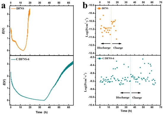 Similarly, to specifically compare the diffusion of lithium-ions in DFNS and DFNS-6 materials, the Li+ diffusion coefficient (DLi+) of DFNS and C/DFNS-6 electrodes in the first charge/discharge cycle was determined using GITT. As can be seen in Figure 10a, the first charge/discharge time of C/DFNS-6 (65 h) is significantly longer than that of DFNS (20 h), which suggests that the covering of the carbon layers and abundant pores alleviate the volume expansion problem and indeed improve the stability of the C/DFNS-6 structure. In addition, DFNS shows a voltage plateau around 0.7 V, corresponding to the formation of the SEI layer in conventional carbonate electrolytes, which is consistent with the CV analysis results (Figure 7). C/DFNS-6 does not show a significant voltage plateau due to the lower content of SiO2. The DLi+ can be calculated for both materials according to Equation (9) [46]: