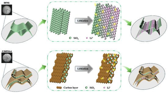 Based on the above characterization analysis and electrochemical analysis, we speculate that the outstanding electrochemical performance of DFNS-6 is due to the synergistic effect of the protection of the carbon layers, the porous structure and the appropriate SiO2 content, as shown in Scheme 2. For pure DFNS, although its large specific surface area and pompon mum-like structure provide active sites and transport channels for Li+, direct contact with the electrolyte accelerates the volume expansion and structural collapse, which, in turn, leads to electrode failure. In contrast, C/DFNS-6, protected by the carbon layers, greatly improves the structural stability and electrical conductivity while alleviating the volume expansion problem, the more porous structure therein also accelerates the Li+ transport, and the suitable SiO2 content provides a good capacity basis. Therefore, C/DFNS-6 possesses excellent reversible specific capacity and cycling stability.