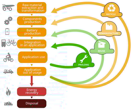 The most preferable action to take is to extend the lifespan of the application for which the battery was produced as much as possible. Thermal management [8,9] and optimal charging strategies [10,11] are some solutions that can help to prolong battery lifetime [12]. When the battery is no longer suitable for its first application, the possibility of giving the battery a second life should be systematically considered. Battery second life can be defined as the complete (referred to as reuse in Figure 1) or partial (referred to as remanufacture in Figure 1) reuse of the battery for the original purpose for which it was designed [13].
