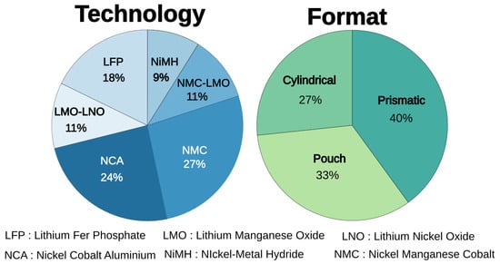 The diversity of their technologies is another important barrier to the near-term growth of a reuse market. The wide variety of automotive battery designs is a major challenge, as they differ in size, electrode chemistry, configuration and state of health, making reuse complex [22]. Different battery cells within the same vehicle can also experience different degradation modes, resulting in different internal impedances, capacities and self-discharge rates [23]. Table A1 shows the characteristics of the world’s best-selling vehicles between 2012 and 2022. Figure 2 shows a synthesis of the different battery technologies and formats used in the most sold vehicles between 2012 and 2022.