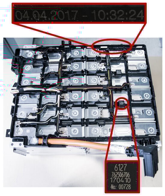 The first stage of the procedure involves a visual inspection of the battery. In this study, a module extracted from a BMW i3 electric vehicle has been used. This checks that the battery has no defects such as traces of impact or swelling on the cells [49]. The various indications shown in Figure 3 show that the module was extracted from a vehicle produced in April 2017.
