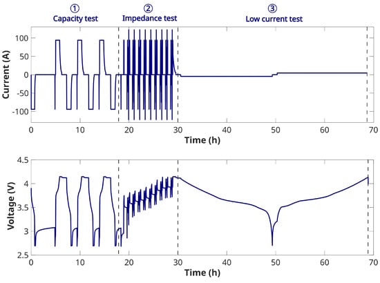 To complete the battery passport, a test consisting of a measurement of capacity, impedance and open circuit voltage is required. Figure 4 shows the current and voltage profiles for this test. Each cell of the module was tested separately.