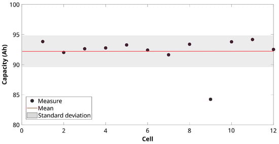 Capacity is the amount of charge a battery can store or deliver at a given current rate and temperature. In this article, capacity is measured in discharge at a current of 1 C during the constant current phase of the first step of the test shown in Figure 4. Data analysis was carried out using the open and free software DATTES 23.05 [52]. Figure 5 shows the capacities of the 12 cells in the second-life module considered. Measurements were made on each cell individually.