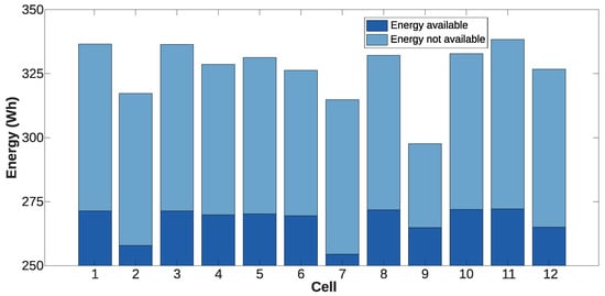 The energy of a battery is a quantity that characterises the duration and intensity of the power it can deliver [53]. This quantity depends on the temperature and the current during the test and the degradation of the battery [54]. The measurement of the maximum available energy is necessary whatever the intended use. This value must be known in order to size the battery according to the requirements of the application. For mobile applications, the energy density of the battery must also be considered as the volume and mass available for the battery is generally limited. In this procedure, the energy available in each cell of the module is measured during step 1 of the characterisation test shown in Figure 4. The energy is calculated using Equation (A6) at a current rate and temperature representative of the intended use. In this study, a discharge current of 1 C (94 A) and a temperature of 25 °C were chosen, but these can be adapted in the case of an evaluation for a specific second-life application. Figure 6 shows the energy of the cells tested. The light blue area indicates a loss in energy due to differences in cell performance.