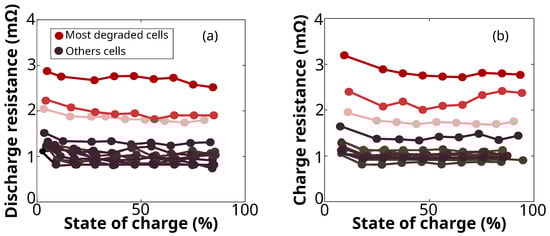 Discharge resistance (a) and charge resistance (b) as a function of the state of charge for the various cells in the module.