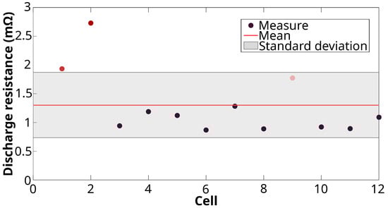 This figure shows that the majority of cells have a resistance on the order of 1 m. Three cells have a higher resistance than the others; they are different from the outlier capacity cell. The most degraded cell has a resistance of around 3 m. The discharge and charge measurements are consistent, since the most degraded cells are the same in charge and in discharge. Figure 8 shows the dispersion of discharge resistance measurements for the 12 cells in the module.