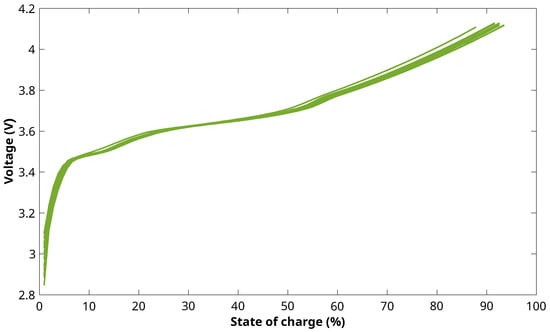 The power of a battery is a measure of the amount of energy it can supply or receive per unit of time. For any application, it is important to take power into account because it determines the speed of charging and discharging. Since the power of batteries decreases as they age, it is necessary to measure it to assess their suitability for a second life. The power that each cell can deliver is quantified according to the Equation (A3) for the discharge power [55]. To determine the power deliverable by a battery, its open circuit voltage must be known. The pseudo-open circuit voltage was measured at a current rate of C/20 and a temperature of 25 °C during the third stage of the characterisation test presented in Figure 4. Figure 9 shows the open circuit voltage as a function of the state of charge.