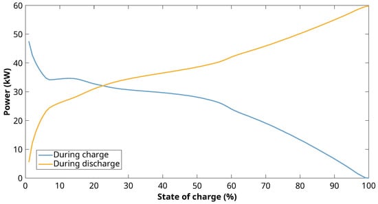 This figure shows that deliverable power is particularly sensitive to state of charge. An accurate estimate of the state of charge is therefore necessary to determine the deliverable power at any given time. The deliverable power during charging is also lower than that during discharging for most of the state of charge range (between 20% and 100%). This result has been observed in several other works [56,57].