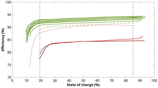 Energy efficiency is a parameter whose quantification is essential in all applications, as energy losses must be kept under control. Knowing the efficiency of the battery and the factors that influence it can therefore help to optimise the sizing and use of this energy storage system. The efficiency of each cell in the module is measured in step 1 of the characterisation test shown in Figure 4. For this test, a current rate of 1 C (94 A) and a temperature of 25 °C have been chosen, but these can be adapted in the case of an evaluation for a specific second-life application. The use of constant current phases makes it possible to calculate the efficiency at a given current rate. However, this choice reduces the range of variation in the state of charge. Cell efficiency as a function of the state of charge is calculated using Equation (A4) [58]. The method used in this article was favoured because it allows for the calculation of the efficiency at a specific current rate, which is a necessity to construct a comparable measure. The authors would also like to highlight the fact that by calculating the mean of the efficiency over the state of charge, as presented in the article, an equivalent result to the more conventional method of calculating energy efficiency is obtained, which is based on a ratio between the discharged and charged energy. Figure 11 shows their evolution.