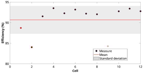 Figure 12 shows the spread of the average efficiency in the module. The average efficiency is calculated by averaging the efficiency over the swept state of charge range for each cell.