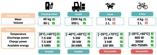Stationary applications are often seen as ideal for second-life batteries, as they generally tolerate lower energy densities than electric vehicles [35]. They allow the use of modules or packs, which avoids prohibitive reconditioning costs [36]. Batteries reused for stationary applications are also subject to stresses comparable to those for mobility applications [37]. However, as the ageing process of degraded batteries is not yet well understood, they should not be used in applications critical to the stability of the grid or human health, for example, for emergency power supply in hospitals.