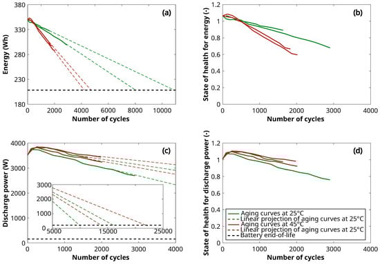 European battery regulations also require the self-discharge rate to be estimated. For mobile use, self-discharge is not an essential characteristic as its effect is slow and limited to periods of less than a month. For the tested battery, the datasheet indicates that the self-discharge rate at 25 °C will reach up to 3.3% loss of state of charge after 200 days of rest [51]. In addition, previous work has shown that when the battery is used in non-extreme conditions, the rate of self-discharge slows down as the battery degrades [58].