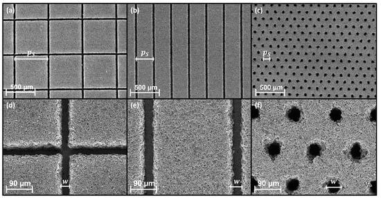 Top-view SEM images of the laser structured anodes with grid (a,d) line (b,e) and hole (c,f) pattern with indicated structure dimension () and pitch (). (SEM: 10 kV accelerating voltage).