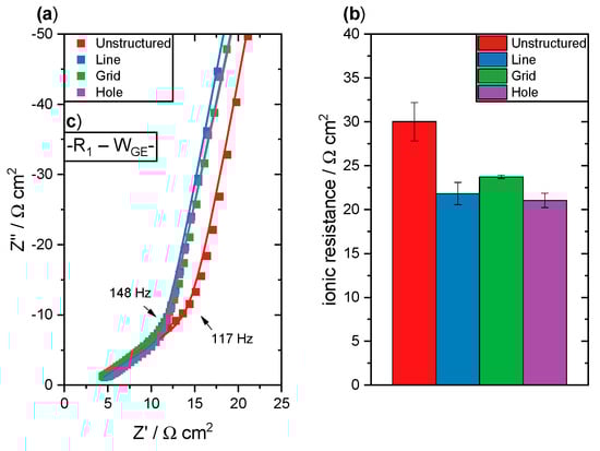 In addition to the characterization of the influence of structured anodes on the electrochemical performance in full-cells, symmetrical cells with structured and unstructured electrodes were built. The anodes used in the symmetrical cells are similar to the set of anodes utilized in the full-cells. Symmetrical cells in blocking conditions, so faradaic processes are suppressed, are used to evaluate porous electrodes regarding their ionic resistivity [,]. To realize blocking conditions, a so-called non-intercalating electrolyte can be utilized, or in the case of an intercalating electrolyte, electrodes in a SOC in which faradaic reactions are suppressed can be used []. For anodes, this refers to a fully lithiated or delithiated state []. The results of the EIS measurements were fitted to the equivalent circuit shown in Figure 2c consisting of a resistor and a generalized finite Warburg element (Equation (S19)). The generalized finite Warburg element is mathematically identical to a transmission line model of resistors and constant phase elements typically used to describe porous electrodes []. The pure resistance represents the sum of all ohmic resistances in the cell as electrolyte and electrical resistance. No semicircles in the high and low frequency regime were observed in the Nyquist plot of our measurements (Figure 2a). A semicircle in the high frequency region of the Nyquist plot would be expected for a high contact resistance or faradaic processes, but can also be observed in the case of various pore geometries [,]. The highest ionic resistance of 30.0 ± 2.2 Ω cm2 was measured for the unstructured reference electrodes. All investigated structure patterns showed lower ionic resistances compared to the unstructured reference electrode, with. 21.0 ± 0.8 Ω cm2 for the hole structure, 21.8 ± 1.3 Ω cm2 for the line structure, and 23.7 ± 0.2 Ω cm2 for the grid structure (Figure 2b). A reduction in ionic resistance of structured electrodes compared to unstructured electrodes with unmatched areal capacity due to mass loss during structuring is known in the literature []. Due to the increase in ionic resistance with increasing coating thickness, such a comparison puts the unstructured electrodes at a disadvantage []. Our results reveal that structured electrodes of various structure patterns also exhibit lower ionic resistances compared to reference electrodes with similar areal capacity and with that a decreased layer thickness compared to structured electrodes.