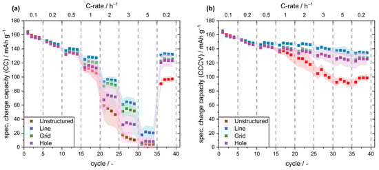 Specific charge capacity after the CC (a) and CCCV (b) phase (without the fifth cycle at each C-rate). The shading indicates the extent of the standard deviation.