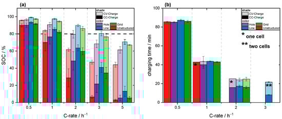 SOC after CCCV charging (a) and the required charging time to a SOC of 80% (b) as a function of C-rate (fifth cycle of the respective C-rate shown; the star symbols indicate the number of cells—out of 3 cells—that have fulfilled the criterion).