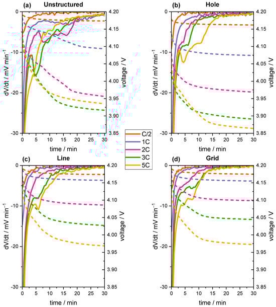 Differential voltage analysis of the voltage relaxation (solid line) and voltage as a function of time (dashed line) in the first 30 min of the 4 h rest period after charging in the fifth cycle at each C-rate for the cells with unstructured (a), hole structured (b), line structured (c), and grid structured (d) electrodes.