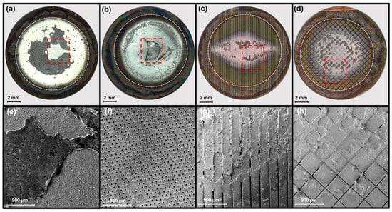 Post-mortem digital microscope images (a–d) and SEM images (e–f) of the unstructured (a,e), hole structured (b,f), line structured (c,g), and grid structured (d,h) electrodes (same set of cells as in Figure 5). White dashed outline marks the anode area which was covered by the cathode and the red dashed outline marks the cut-out of the respective SEM image.
