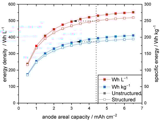Coin cells were used in this study because they are easy to manufacture, reproducible, and safe to handle due to their low capacities. However, if one wants to identify the advantages and disadvantages of cells with structured electrodes in terms of the achievable energy and power densities, one must consider commercial cell designs, as the cell design strongly influences the achievable energy density. For this purpose, the energy and power density were calculated using the geometric data from a commercial pouch cell and the material and electrode characteristics in the work presented []. The weight of the packaging material of the cell, i.e., pouch bag and the tapes, is neglected in the calculation. The underlying data for the calculation and the formulae can be found in Equations (S1)–(S18). It should be noted that the stack height is not considered as a limiting factor in this calculation and that the energy density of 674 Wh L−1 of the commercial pouch cell in reference [] (anode areal capacity of 5.23 mAh cm−2) is higher than the data calculated in this work due to the use of optimized electrodes in terms of porosity, active material share, and N/P-ratio. In Figure 7, the calculated specific energy and energy density as a function of the anode areal capacity is shown. The benefits of the implementation of thick-film electrodes can be seen in the increasing energy density and specific energy on cell level with increasing areal capacity. In our calculation, increasing the anode areal capacity from 2 mAh·cm−2 to 4 mAh·cm−2 would result in an increase in energy density of 16%. Figure 7 also shows that structuring the anode with a 11% mass loss reduces the achievable energy density at cell level by around 6%. This makes it clear that the comparison of structured electrodes with unstructured electrodes, even if these electrodes have similar areal capacities, puts the unstructured electrodes at a disadvantage when considering large-format cells, as the same energy density could also be achieved with unstructured electrodes with a lower areal capacity. In our case, with an areal capacity of approximately 4.4 mAh·cm−2 of the structured electrodes and an average mass loss of 11%, the cells with structured electrodes would have to be compared with cells with unstructured electrodes with an areal capacity of 3.15 mAh·cm−2 (as indicated by the dotted lines and arrows in Figure 7) in order to compare large-format cells with the same energy density later on.