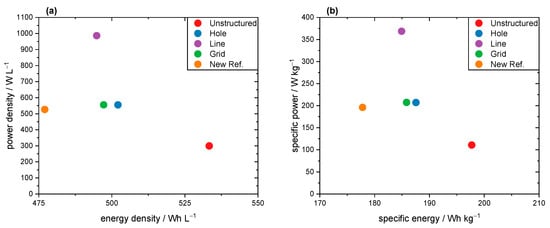 The resulting power and energy densities as well as the specific power and energy are plotted in Figure 8. Since the information and the tendency of the data regarding specific energy and energy density are highly similar, the further discussion is limited to the energy density. The relatively high N/P ratio of 1.25 of the “New Ref.” cells is the reason for their lower energy density compared to the other cells with an average N/P ratio of 1.16. Comparing the cells with unstructured electrodes, a decrease in areal capacity from 4.3 mAh cm−2 to 3.2 mAh cm−2 increases the power density by 76% from 299 W L−1 to 526 W L−1. All investigated cell types with structured electrodes reached higher calculated power densities than the unstructured reference cells with 3.2 mAh cm−2 and 4.3 mAh cm−2. With 987 W L−1, the cell with line structured electrodes has the highest calculated power density of all investigated cell types. Compared to the cell with unstructured electrodes of similar areal capacity (4.3 mAh cm−2), this means an increase in power density of 230% with an energy density that is 6% lower and compared to the “New. Ref.” cells (3.2 mAh cm−2), an increase in power density of 87% with a 4% higher energy density. The high N/P ratio of the “New Ref.” cells (N/P ratio of 1.25) lead to cells with a lower areal capacity of the cathode and thus, to lower current densities at the same C-rate compared to cells with the same anode and lower N/P ratio. This suggests that cells with a areal capacity of 3.2 mAh cm−2 and an N/P ratio of 1.16, which would lead to a comparable energy density to the cells with structured electrodes in this work, will have an even lower rate capability and thus, the positive influence on the power density of structured cells with the same N/P ratio and energy density will be even more pronounced.