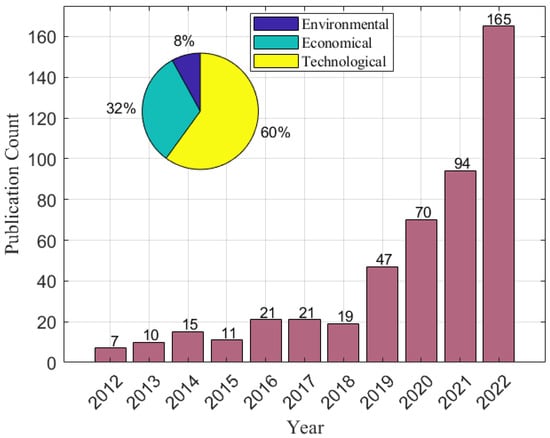 The exponential proliferation of batteries in the market underscores the urgent need for implementing effective and sustainable strategies to manage their EOL phase. This is essential to mitigate potential environmental risks and optimize resource utilization. As batteries reach their EOL in primary applications, the imperative of managing and utilizing them efficiently becomes increasingly paramount. This could entail developing recycling technologies or exploring alternative uses for repurposed batteries [,]. Consequently, the realm of retired EV batteries has experienced a significant surge in scientific, business, and policy interest over the past decade. Figure 1 illustrates the notable uptick in the publication of papers during this period.