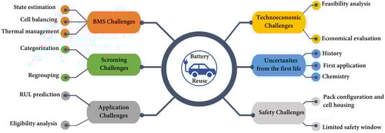 Figure 2 provides an overview of the main challenges related to battery repurposing, categorized into six groups: