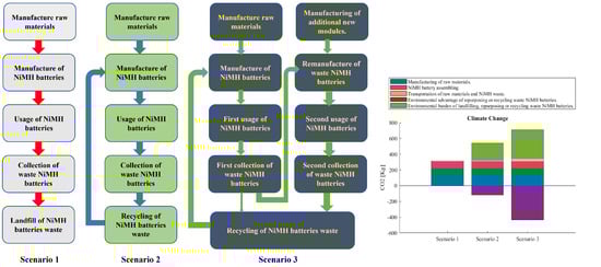Different scenarios for NiMH batteries (adapted with permission from []). In scenario 1, the battery will experience the non-recycling process without reusing and recycling. Scenario 2 considers the end of the first use of the battery as EOL and then consigning batteries straight to the recycling plant. Finally, in scenario 3, after the first use of the battery, it will go through the reusing for its second usage. EOL is defined based on the end of the second battery usage and, finally, the recycling process. Results from the LCA analysis on the climate change impact of each scenario in terms of CO2 emissions reveal that choosing to reuse or recycle waste NiMH batteries instead of directly disposing them in landfills significantly decreases the absolute environmental impact.