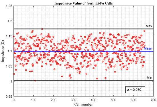 DC internal resistance measurement results for 700 fresh Li-Po Cells in the same SOC to show the variation after formation cycling with a variation coefficient (standard deviation/mean) of 0.030. The minimal and maximal resistances that define the window are 1 mΩ and 1.17 mΩ, respectively.