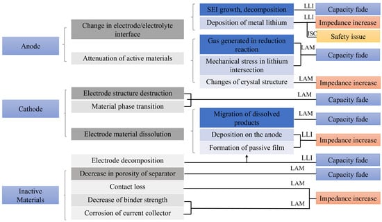 Main aging mechanism taking place in the battery’s anode, cathode, and other inactive components with their main influences on either the reduction in capacity or the rise in impedance or, in the worst case scenario, leading to Internal Short Circuit (ISC) (adapted with permission from []). Loss of active material (LAM) and loss of lithium inventory (LLI) result in reduced capacity due to reduced electrode substance and lithium ions number. Growth in solid electrolyte interface (SEI) in anode materials also contributes to internal impedance increase.