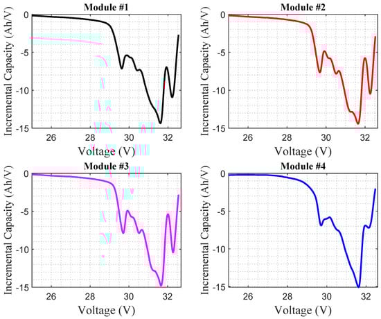 The relation between the LiB’s voltage with respect to the capacity is almost like a flat curve, so a small error in the battery voltage measurement leads to a large estimation inaccuracy. By taking the derivative of the curve, the ICA method converts this flat curve into a curve with distinguishable peaks. Information related to the battery electrochemical degradation mechanism can be found in the resulting IC derivative curves. This means that different indicators that come from the IC curve, e.g., the information related to the peaks, such as the peak amplitude, location, and area under the peak, can be used to estimate the SOH of the battery. One of the major advantages of this technique is its capability to perform in situ measurements during the normal operation of the battery. The technique comes with considerable information about the internal phenomena of the battery. As an example, Figure 6 shows the IC curves of four modules from the same battery pack used for eight years in a hybrid electric vehicle (HEV). As expected from the capacity measurement of these four modules (module number 4 has the lowest capacity compared to other modules), module 4 has the lowest right-most peak. This means that this module experienced more loss of lithium inventory (LLI) than the other modules. The loss of active materials and the solid electrolyte interphase could be the potential causes of this peak. Ohmic resistance increases, usually happening when the battery ages and shifts the whole IC curve to the higher voltage [], and can be seen for modules 2 and 3 in this experiment.
