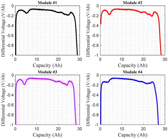 This method is usually used to analyze the battery degradation based on the main mechanisms, e.g., loss of active material, loss of lithium inventory, and loss of cathode materials. Figure 7 shows the DV curves of the same modules used in the ICA analysis of Figure 6. The curve reveals information related to battery aging and its SOH that can be interpreted from peak analyzing.
