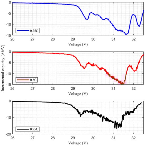 Our experience based on laboratory measurements has shown that improving the method’s accuracy and peak analysis in IC/DV curves requires measurements in low Crate conditions, which takes several hours and is not feasible for battery repurposing. Figure 8 illustrates the result of the battery capacity measurement at three different discharge current rates on the same lithium-ion manganese oxide (LMO) battery module as Figure 6 and Figure 7. Using a higher Crate results in two significant changes in the IC curve. First, the increase in noise mandates the use of Gaussian filters, which leads to a loss of information, and more importantly, it becomes difficult to distinguish peaks. This was further observed in a subsequent measurement at high currents (voltages), where one peak became indistinguishable and therefore found missing.