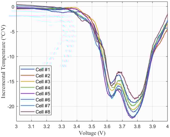 To evaluate the applicability of this method, the authors monitored the temperature on four different modules from the same battery pack of an HEV. The experiment aimed to investigate the correlation and dependency of the DT curves on the module capacity. Each module contains eight cells, and a K-type thermocouple measured the surface temperature of each cell. During the temperature monitoring, it was noticed that the temperature of one cell inside a module is not only a function of the cell parameter itself but is also affected by the adjacent cells inside the module. The uncertainties related to the location of the cell within the module are always a big challenge for achieving good accuracy in the DTA method. It is also worth mentioning that the curves need data processing across all three differential methods to filter out high-frequency noise. During the filtering, some information will be lost, which again will affect the method’s reliability and accuracy. Figure 9 shows the DT curves of eight cells inside a module concerning the voltage changes during the discharge at 1C.